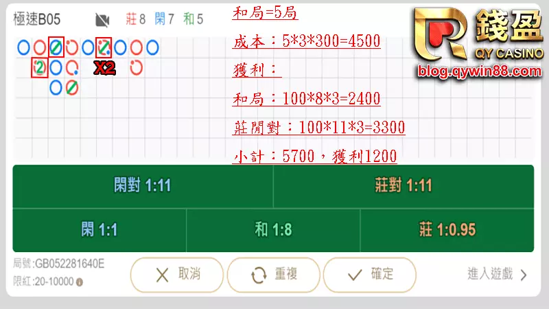 這種百家樂玩法劍走偏鋒,只拚大注,我們不玩基本的百家樂單跳、雙跳、長龍,而是把目標放在八倍賠率的和局身上,每把和局後面我賭一樣會在開一次和局,所以每把和後面都下和。