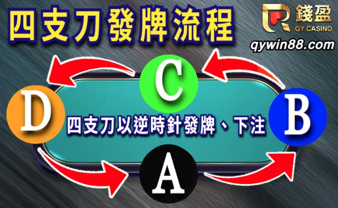 四支刀遊戲一般來說都是2至5人所組合而成的牌局(更多人當然也可以),當遊戲開始後,發牌人會依逆時針的方式由下一家玩家開始發牌,發牌至最後的一定為發牌者本人,每位玩家則會收到四張撲克牌,詳細流程將在下方教大家四支刀怎麼玩!